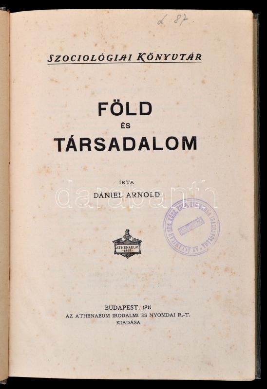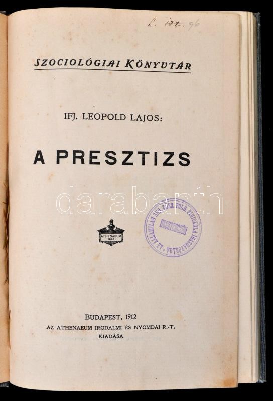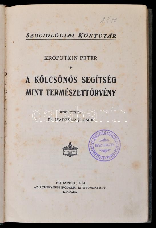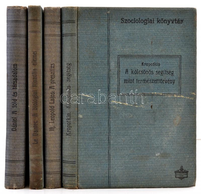 A Szociológiai Könyvtár 4 kötete: Feliz La Dantec: a biológiai filozófia elemei. H. Leopold Lajos: A presztÃzs; Kropotkin: A kölcsönös segÃtség, mint természettörvény. Daniel Arnold: Föld és társadalom. Bp., 1905-1908 Athenaeum. Egészvászon sorozatkötésben.