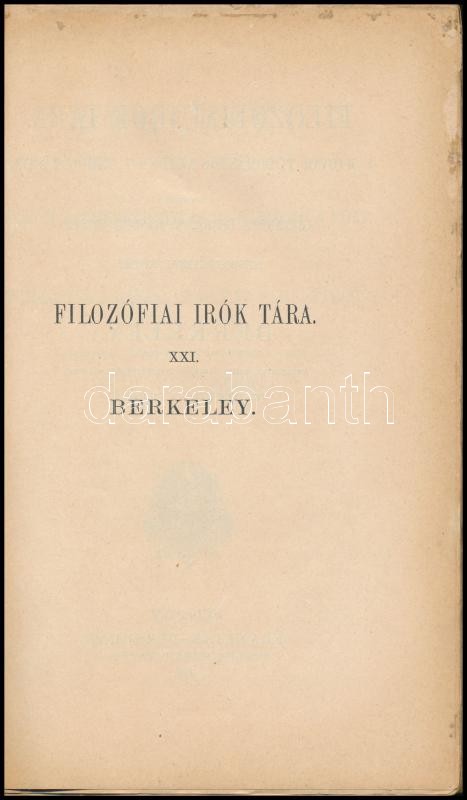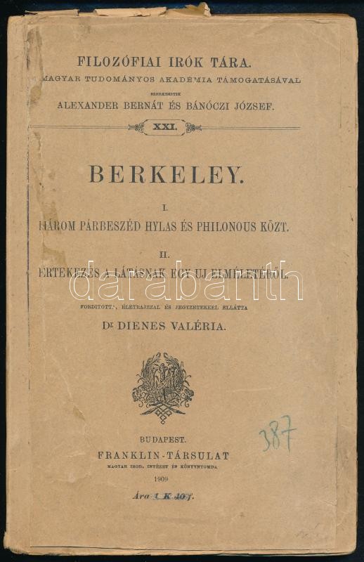[George] Berkeley: I. Három párbeszéd Hylas és Philonous közt. II. Értekezés a látásnak egy új elméletéről. Fordította, életrajzzal és jegyzetekkel ellátta: Dr. Dienes Valéria. Filozófiai Írók Tára XXI. Bp., 1909, Franklin, 234+1 p. Átkötött papírkötés, az eredeti papírborítótót felhasználták az átkötéskor.