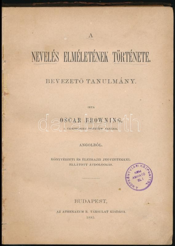 Oscar Browning: A nevelés elméletének története. Fordította: Kármán Mór. Bp.,1885, Athenaeum, 4+206+2 p.+12 sztl. lev. Első kiadás! Átkötött aranyozott gerincű félvászon-kötés, kissé kopott borítóval, számos aláhúzással, lapszéli jegyzettel, a végén, bekötött 12 sztl. lev. kézzel írt jegyzetanyag.