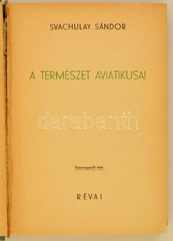 Leírás: Svachulay Sándor: A természet aviatikusai. Harc a levegőért. Bp.,é.n., Révai. Kiadói félvászon-kötés, kissé laza fűzéssel.