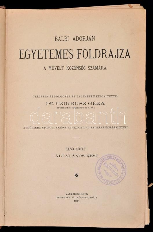 Balbi Adorján: Egyetemes Földrajza a művelt közönség számára Átdolg. és kibőv. Czirbusz Géza.. I. kötet. Általános rész. A szövegbe nyomott számos ábrázolattal és térképmelléklettel. Nagybecskerek, 1893, Pleitz Fer. Pál. Korabeli félvászon kötésben.