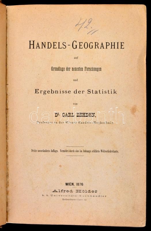 Dr. Carl Zehden: Handels-Geographie auf Grundlage der neuesten Forschungen und Ergebnisse der Statistik. Wien, 1876, Alfred Hölder, 6+515 p.+1 kihajtható térkép-melléklettel. Német nyelven. Átkötött félvászon-kötés, kopott borítóval, javított gerinccel, megerősített kötéssel, szakadozott térkép-melléklettel./