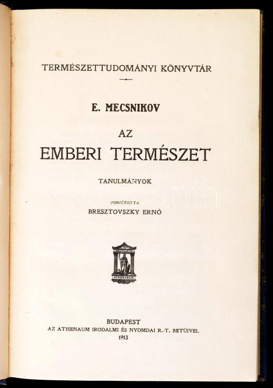 E. Mecsnikov: Az emberi természet. Bp., 1913, Athenaeum. Kiadói egészv... https://www.darabanth.com/hu/329-Gyorsarveres/329.0/Konyvek/Konyvek-Termeszettudomany-medicina~1000009/E-Mecsnikov-Az-emberi-termeszet-Bp-1913-Athenaeum-Kiadoi-egeszvaszon-kotes-kisse-kopo~II1834770