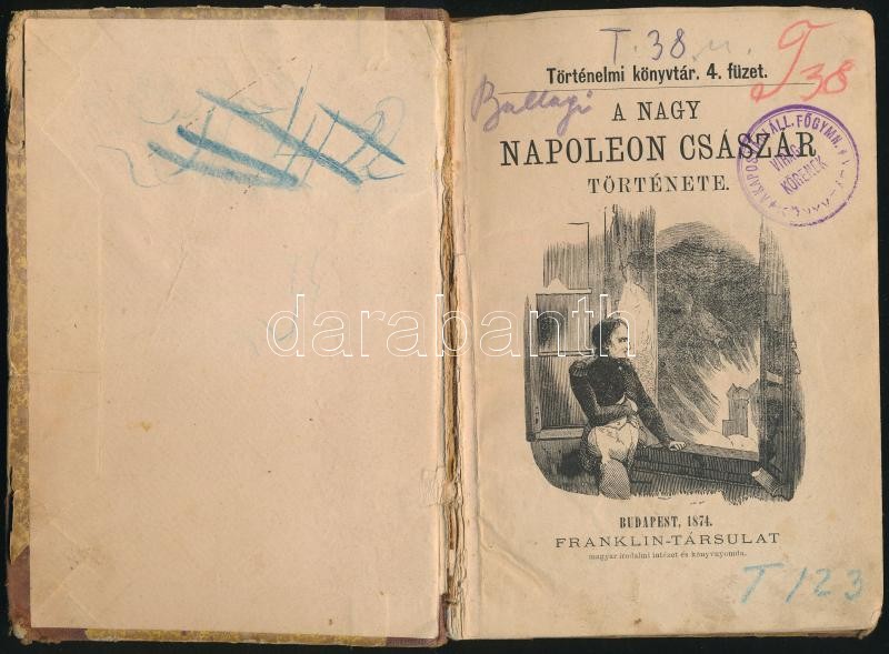 A nagy Napoleon császár története. Történelmi könyvtár 4. füzet. Bp.,1874, Franklin, 120 p. Átkötött félvászon-kötés, kopott, sérült borítóval, foltos, intézményi bélyegzővel.
