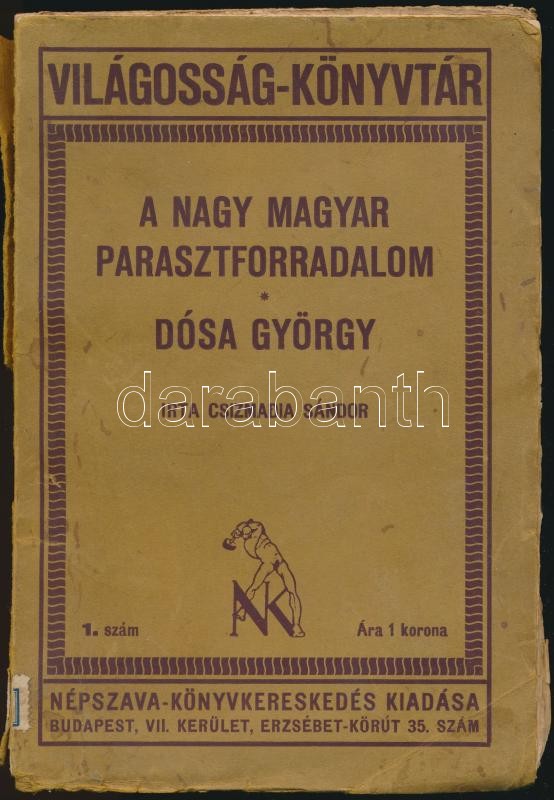 Leírás: Csizmadia Sándor: A nagy magyar parasztforradalom. Dósa György. Világosság-könyvtár 1. szám. Bp.,1914, Népszava. Kiadói papírkötés, szakadt borítóval, sérült gerinccel, részben szétvált kötéssel.