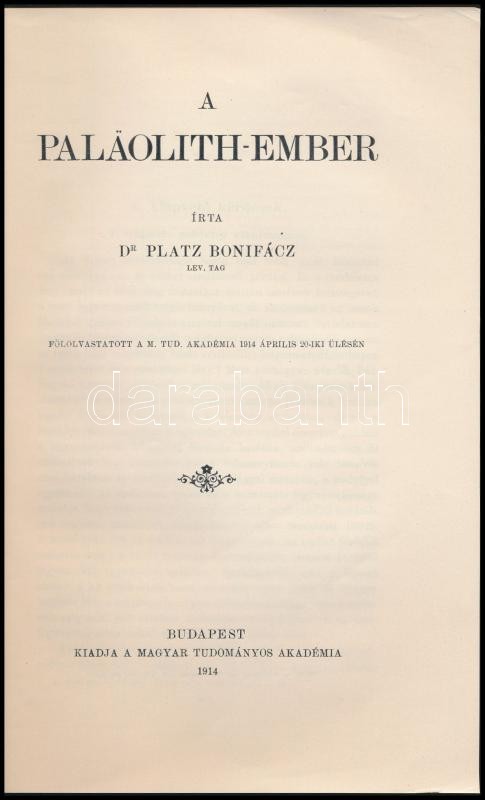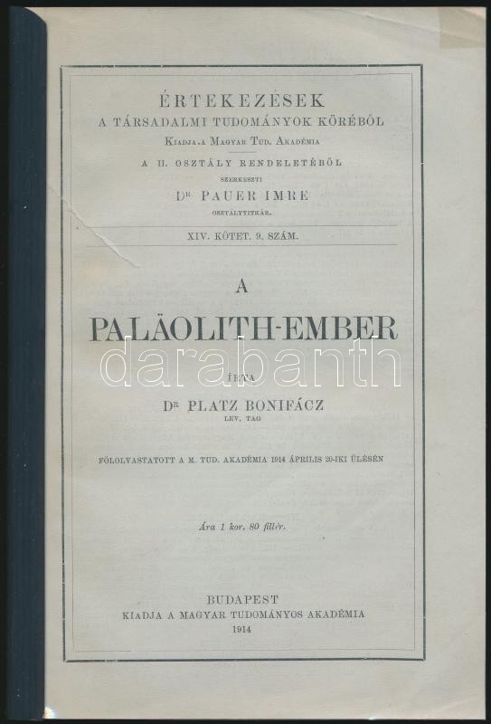 Dr. Platz Bonifác: A paläolith-ember. Értekezések a társadalmi tudományok körébÅ‘l XIV. kötet. 9. szám. Bp.,1914, MTA, 72 p. Modern fűzésű-kötésben, az eredeti papÃrborÃtókat is bekötötték, jó állapotban.