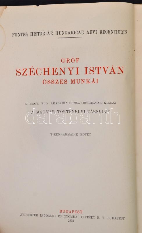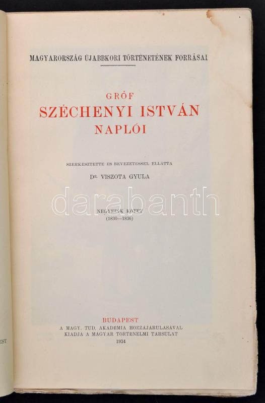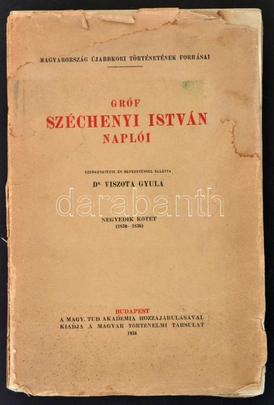 Gróf Széchényi István összes munkái XIII. kötet: Széchényi István naplói IV. kötet. (1830-1836.) Szerkesztette és bevezetéssel ellátta: Dr. Viszota Gyula. Magyarország Újabbkori Történetének Forrásai. Fontes Historiae Hungaricae Aevi Recentioris. Bp.,1934, Magyar Történelmi Társulat,(Sylvester Irodalmi és Nyomdai Intézet Rt.-ny.), LXXII+754 p. Kiadói papírkötés, szakadt, sérült, foltos borítóval, laza fűzéssel, felvágatlan lapokkal.