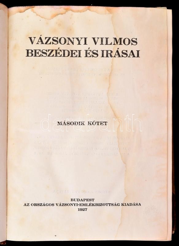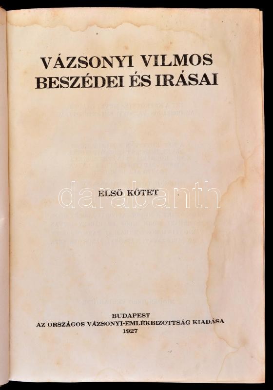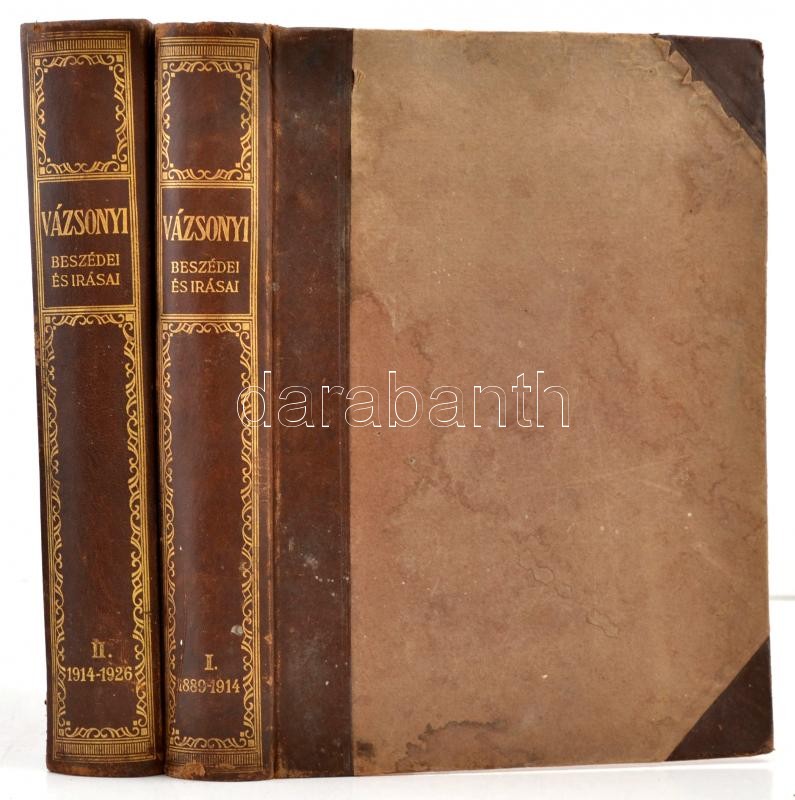 Vázsonyi Vilmos beszédei és írásai I-II. A két kötettben foglalt beszédeket, írásokat összegyűjtötte és korrajzi bevezetésekkel, kisérő jegyzetekkel ellátva, sajtó alá rendezte: Dr. Csergő Hugó és Balassa József. Előszót írt a műhöz: Apponyi Albert, Esterházy Móric,és Bárczy István. Vázsonyi Vilmos életrajzát: Pakots József, a zárószavát Dr. Vázsonyi János írta. Bp., 1927, Országos Vázsonyi-Emlékbizottság. Kiadói kissé kopottas aranyozott félbőr kötés. Ázásnyomokkal