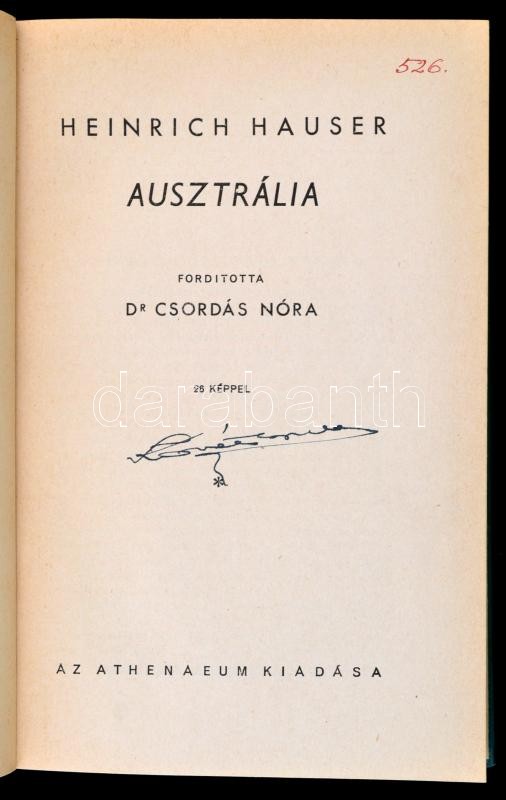 Heinrich Hauser: Ausztrália. Fordította: Dr. Csordás Nóra. Ismeretlen Világok. Bp.,é.n.,Athenaeum. Kiadói egészvászon-kötés, az eredeti papír védőborítót hátulra beragasztották, jó állapotban.