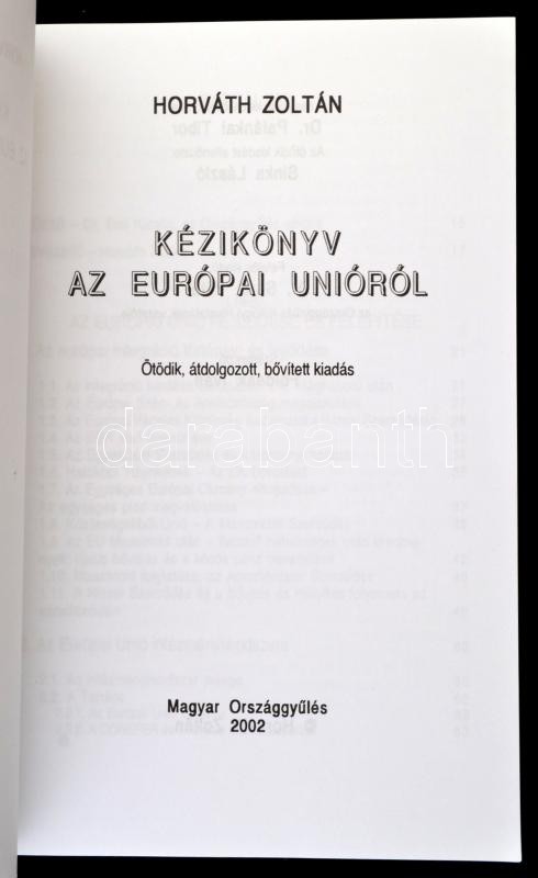 Horváth Zoltán: Kézikönyv az Európai Unióról. Bp., 2002, Magyar Ország... https://www.darabanth.com/hu/329-Gyorsarveres/329.0/Konyvek/Konyvek-Utazas-helytortenet~1000001/Horvath-Zoltan-Kezikonyv-az-Europai-Uniorol-Bp-2002-Magyar-Orszaggyules-Otodik-a~II1640426