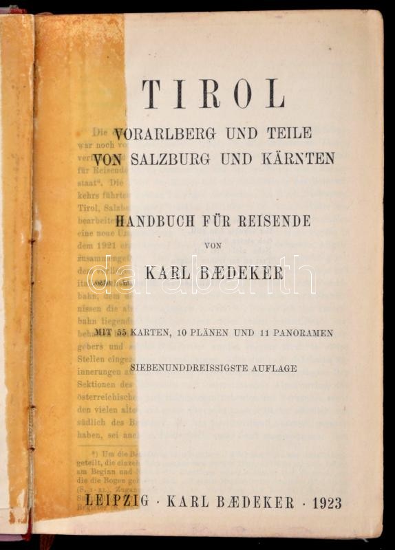 Karl Baedeker: Tirol, Voralberg und Teile von Salzburg und Kärnten. Handbuch für Reisiende. Leipzig, 1923, Karl Baedeker, XL+512 p. 37. kiadás. Német nyelven. Kiadói aranyozott egészvászon kötés, kissé viseltes állapotban, kopott borítóval, pár helyen amatőr módon javított kötéssel, egy térkép kijár, egy lap (31-32.) szakadt, sérült. / Linen binding, some pages repaired, one page damaged, one map coming out, in German language.