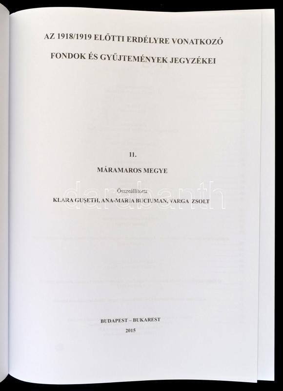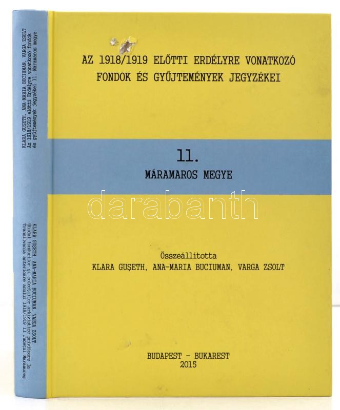 Máramaros megye. Az 1918/1919 előtti Erdélyre vonatkozó fondok és gyűjtemények jegyzékei. 11. Összeállította: Klara Guseth, Ana-Maria Buciuman, Varga Zsolt. Bp.-Bukarest, 2015, Magyar Nemzeti Levéltár-Romániai Nemzeti Levéltár. Magyar és román nyelven. Kiadói kartonált papírkötés, az elülső borítón sérüléssel, amúgy jó állapotban.