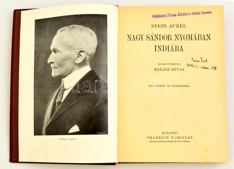 Stein Aurél: Nagy Sándor nyomában Indiába. Fordította: Halász Gyula. Magyar Földrajzi Társaság Könyvtára. Bp.,é.n., Franklin. Kiadói aranyozott egészvászon sorozatkötésben, kissé kopott gerinccel, intézményi bélyegzővel.