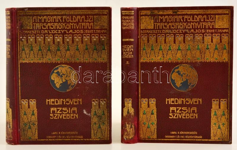 Sven Hedin: Ázsia szívében I-II. kötet. Fordította: Dr. Thirring Gusztáv. 59 képpel és 1 térképpel és 63 képpel és 1 térképpel. Magyar Földrajzi Társaság Könyvtára. Budapest, é. n., Lampel R. (Wodianer F. és Fiai) Rt., 189+240 p. Kiadói dúsan aranyozott egészvászon sorozatkötésben. Kissé piszkos, de jó állapotú.