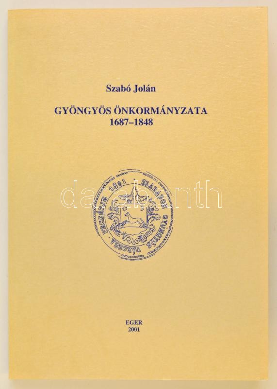 Szabó Jolán: Gyöngyös önkormányzata. 1647-1848. Tanulmányok Heves Megye Történetéből. 15. Eger, 2001. Heves Megyei Levéltár. Kiadói papírkötés. Megjelent 500 példányban.+ Szabó Jolán: Gyöngyös önkormányzata. 1647-1848. Doktori (Ph.D.) értekezés tézisei. Debrecen, 2003.+ Szabó Jolán PhD értekezésének nyilvános vitájának meghívója.