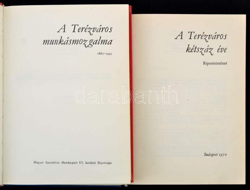 Terézváros és munkásmozgalma. I-II. rész. I. rész: Pille György: A Terézváros kétszáz éve. II. rész: A Terézváros munkásmozgalma. Szerk.: Szinai Miklós. 1867-1945. Bp.,1970, VI. kerületi Tanács Végrehajtó Bizottsága-MSZMP VI. kerületi Bizottsága. Fekete-fehér fotókkal. Kiadói nylon-kötés, kiadói kartontokban.