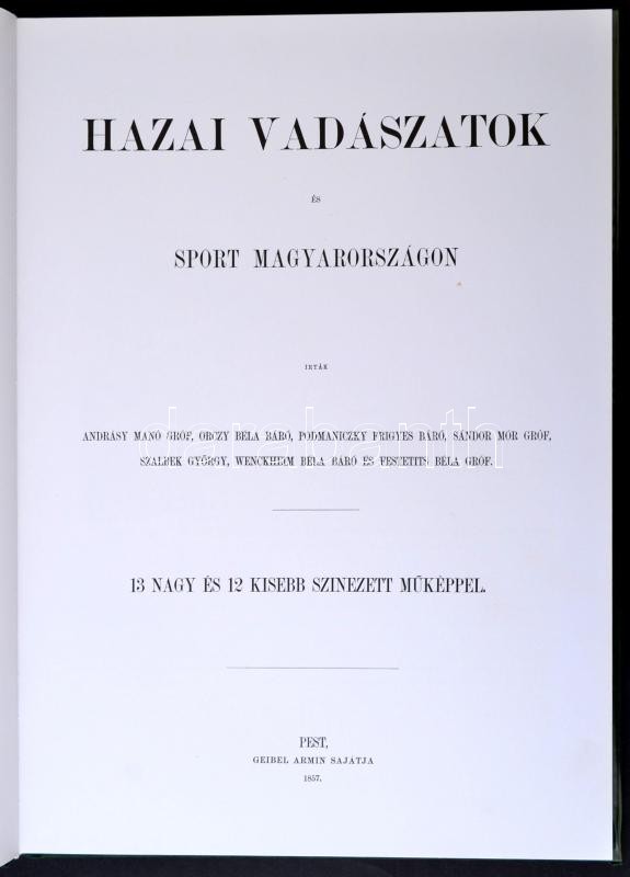 Andrásy Manó-Orczy Béla et al.: Hazai vadászatok és sport Magyarországon. Somorja, 2006, Méry Ratio Kiadó. Kiadói aranyozott bársony-kötés. Az 1857-ben Geibel Ármin által kiadott mű első hasonmás kiadása. Megjelent 2000 példányban. Szép állapotban.
