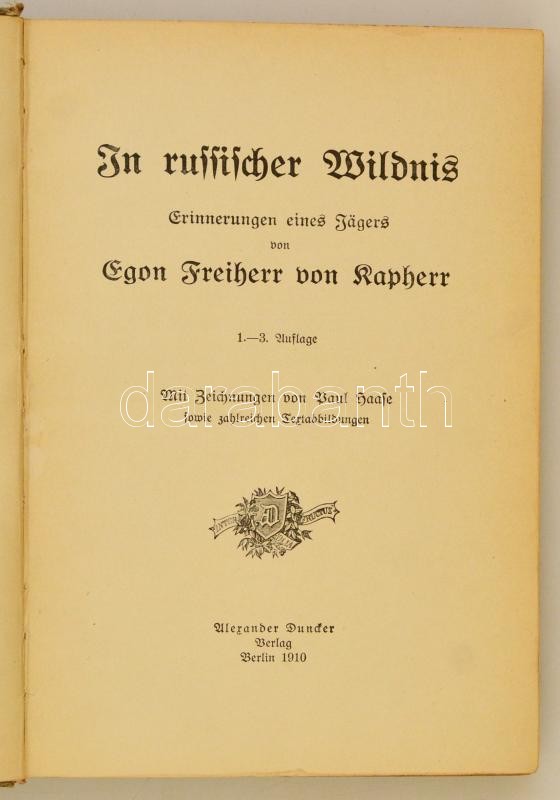 Egon Freiherr von Kapherr: In russischer Wildnis. Erinnerungen eines Jägers. Berlin, 1910, Alexander Duncker. Német nyelven. Fekete-fehér fotókkal illusztrált. Átkötött egészvászon-kötés, márványozott lapélekkel, foltos borítóval.