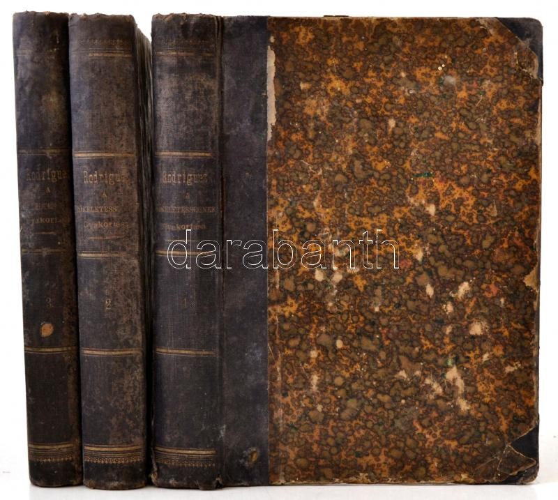 A keresztyén tökéletességnek és a keresztény erényeknek gyakorlása I-III. kötet. Teljes!. Rodriguez Alfonz J. T. Fordította Jáky Ferencz. Kalocsa, 1874-77, Malatin és Holmeyer érseki könyvnyomdászok betűivel 552p., 531p., 431p., Korabeli, kissé koszos félvászon kötésben. Dombi Márk cisztercita szerzetes, író tulajdonosi névbejegyzésével.