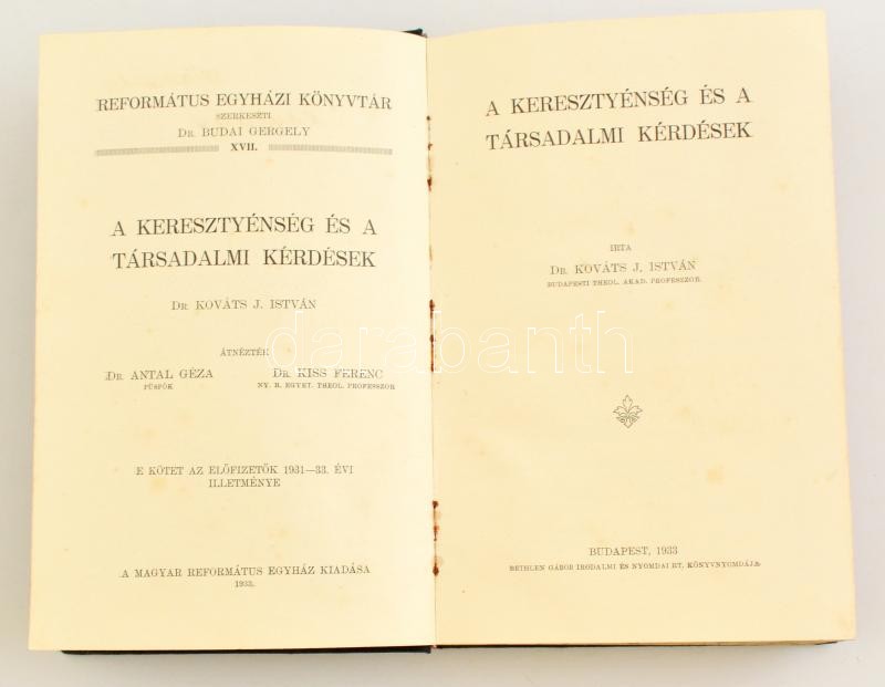 Dr. Kováts J, István: A keresztyénség és a társadalmi kérdések. Református egyházi könyvtár XVII. kötet. Debrecen, 1933, Magyar Református Egyház, Debrecen Sz. Kir. Város és Tiszántúli Református Egyházkerület Könyvnyomda-Vállalata, Kiadói aranyozott egészvászon-kötés, márványozott lapélekkel, kissé foltos borÃtókkal
