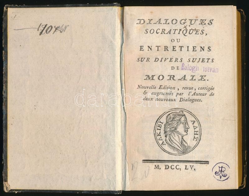 [Jacob Vernet:] Dialogues socratiques, ou entretiens sur divers sujets de Morale. hn.,1755,k.n.XII+299 p. Francia nyelven. Későbbi kopott kartonált papírkötés, hiányzó elülső előzéklappal.
