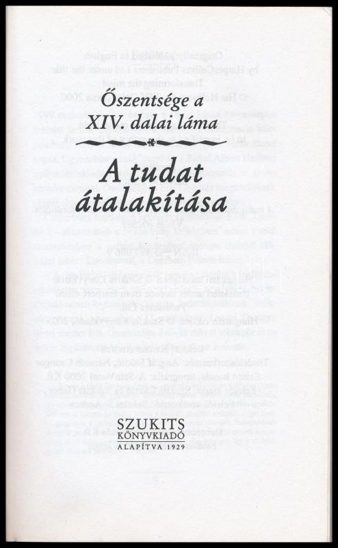 Leírás: Őszentsége a XIV. dalai láma. A tudat átalakítása. Fordította: Szántai Zsolt. Szeged, 2005, Szukits. Kiadói papírkötés.