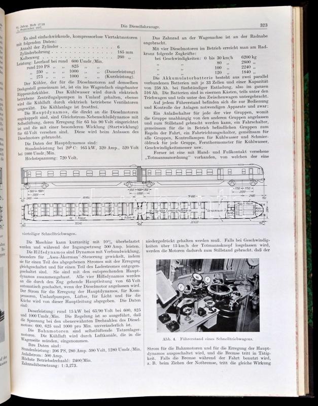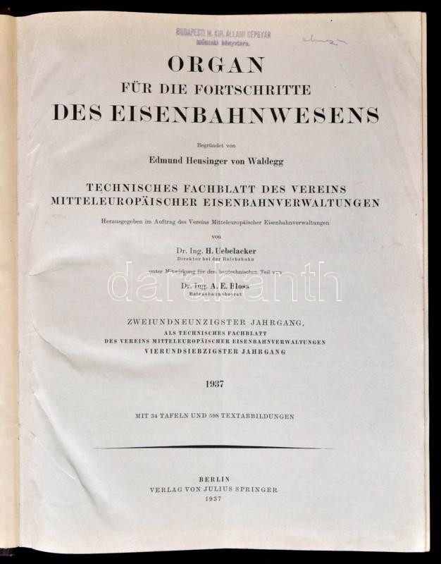 1937 Organ für die Fortschritte des Eisenbahnwesens. 92. évf. Berlin, 1937, Julius Springer. Német nyelven. Átkötött egészvászon-kötés, intézményi bélyegzővel.