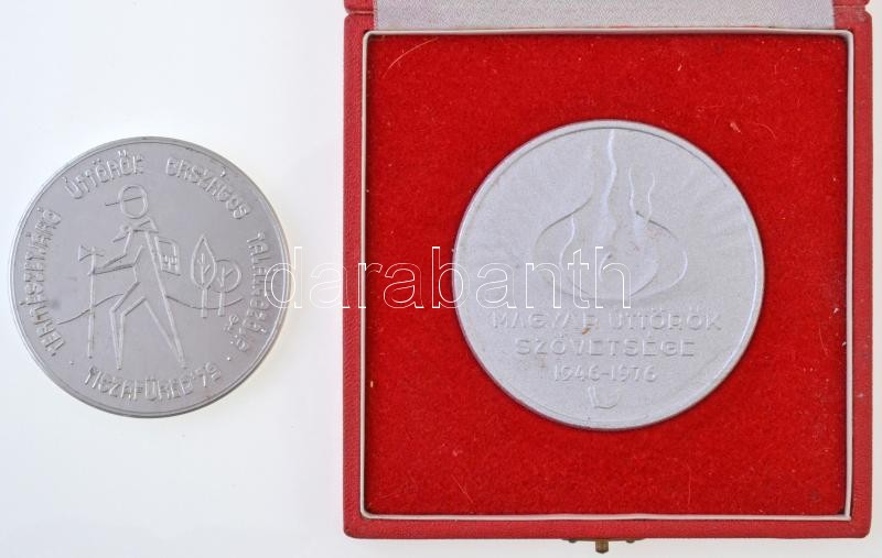 Leírás: 1976. "Magyar Úttörők Szövetsége 1946-1976" egyoldalas Al plakett, eredeti tokban (70mm) + 1979. "Természetjáró Úttörők Országos Találkozója - Tiszafüred '79" egyoldalas Al plakett (65mm) T:2