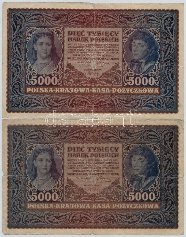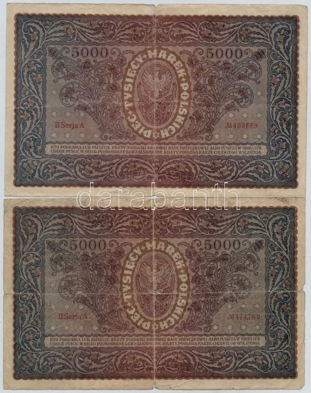Poland 1920. 5000 Marek (2x... https://www.darabanth.com/hu/329-Gyorsarveres/329.0/Numizmatika/Kulfoldi-bankjegyek~2500012/Lengyelorszag-1920-5000M-2x-TIII-III--Poland-1920-5000-Marek-2x-CF-VG~II1835654