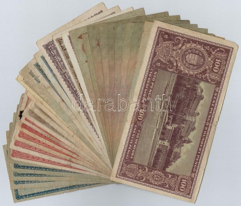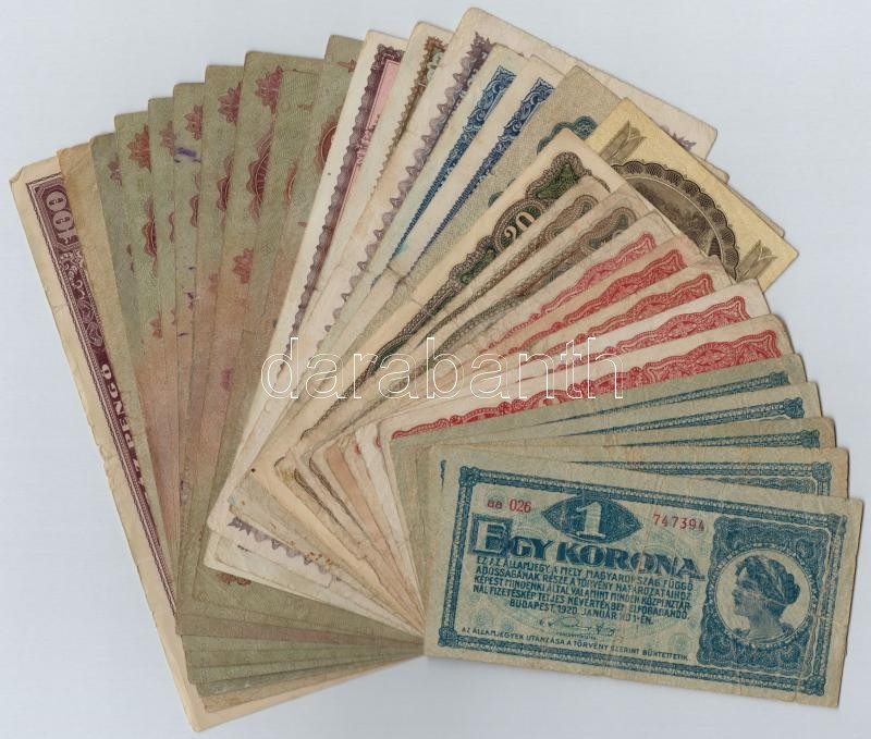 Leírás: Vegyes: 30db-os korona-pengő-forint tétel, közte "A Vöröshadsereg Parancsnoksága" pengő bankjegy is T:III,III-