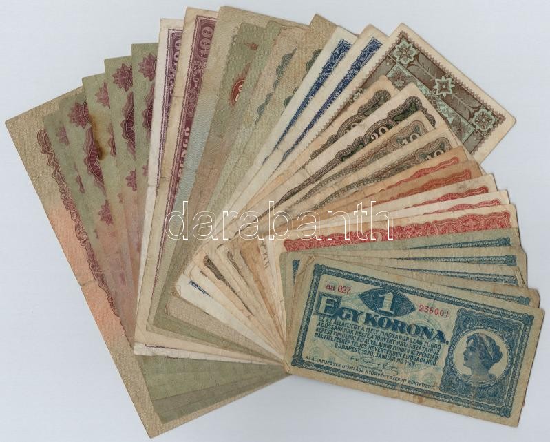 Leírás: Vegyes: 30db-os korona-pengő tétel, közte "A Vöröshadsereg Parancsnoksága" pengő bankjegy is T:III,III-