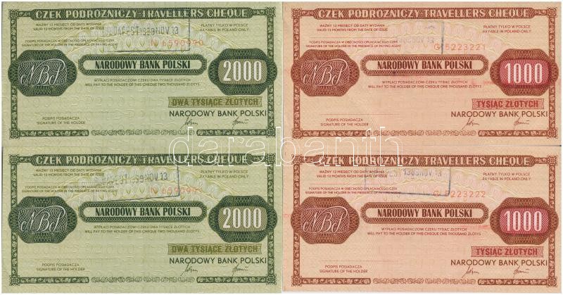 Leírás: Lengyelország 1989. 1000Zl (2x) sorszámkövető + 2000Zl (2x) sorszámkövető "Lengyel Nemzeti Bank" utazási csekk T:II