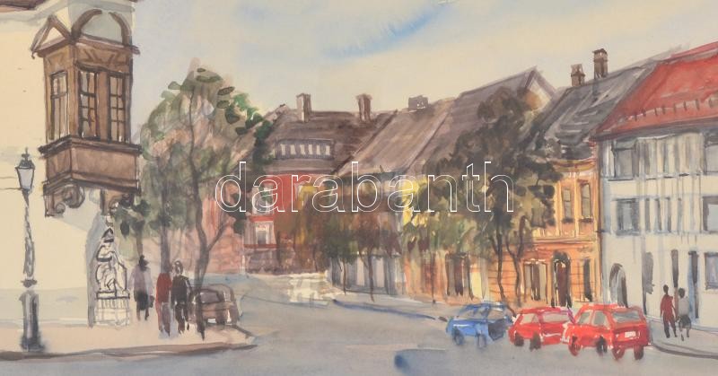 Élesdy István (1912-1987): Régi Városháza, sarok (Budai várnegyed). Akvarell, papír, jelzett, hátoldalán címmel feliratozott, üvegezett fa keretben. Párdarabja reprodukált Pereházy Károly: A várnegyed. Élesdy István akvarelljeivel. Bp., 1979, Képzőművészeti Alap könyvében, 8. tábla (Szentháromság utca). 40x60 cm / István Élesdy (1912-1987): Old Townhall (Buda castle district). Watercolour on paper, signed, with the title written on the back, framed under glass. 40x60 cm