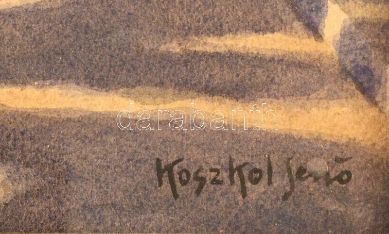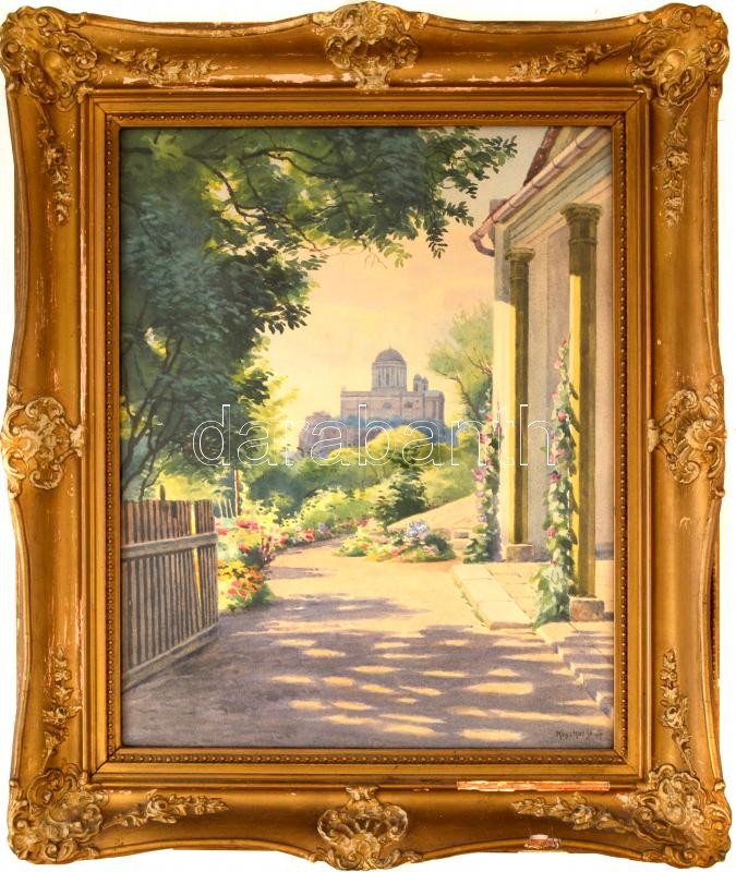 Leírás: Koszkol Jenő (1868-1935): Kilátás az Esztergomi bazilikára. Akvarell, papír, jelzett, üvegezett keretben, 49×40 cm