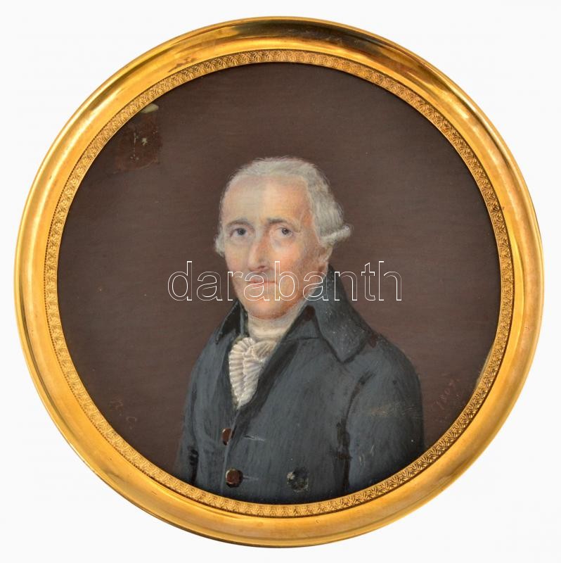 Leírás: N.C. 1809 jelzéssel: Miniatúra. akvarell, karton. d: 8 cm, réz keretben, kis folttal / Signed miniature (N.C. 1809). Water color, cardboard with spot