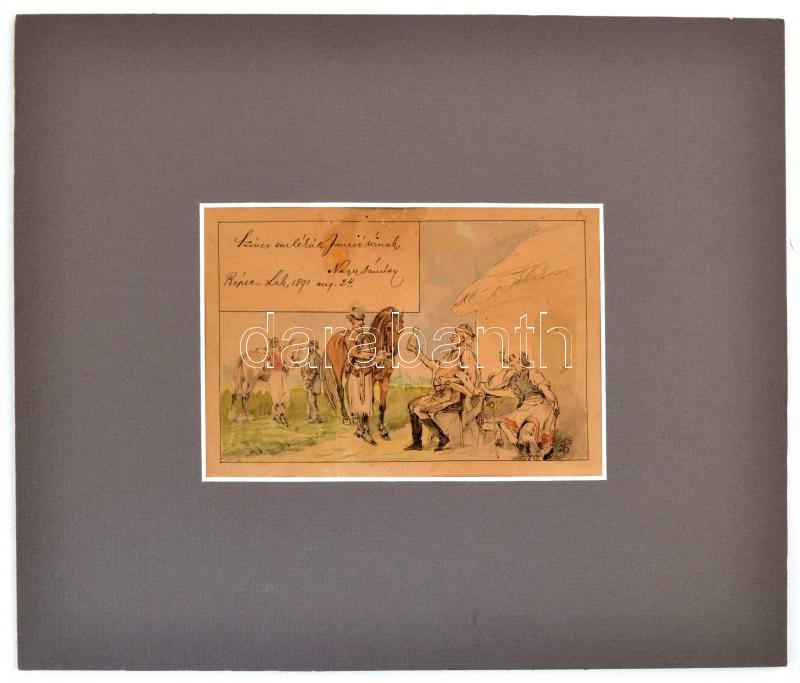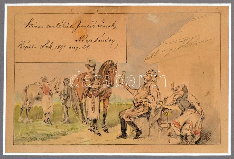 Nagy Sándor (1869-1950): Fogadó, Répcelak. Tus, akvarell, papír, paszpartuban. Jelzett, ajándékozási sorokkal: "Szíves emlékül Jancsó úrnak, Nagy Sándor. Répce-Lak, 1891. aug. 24." 9,5 x 14,5 cm