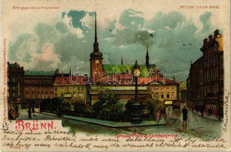 1900 Brno, Brünn; Grosser Platz, Jacobskirche / square, church. Meteor... https://www.darabanth.com/hu/33-Nagyaukcio/33.1/Kepeslapok/Cseh-Koztarsasag~13924/1900-Brno-Brunn-Grosser-Platz-Jacobskirche-square-church-Meteor-No-559-hold-to-light-litho~II2142715
