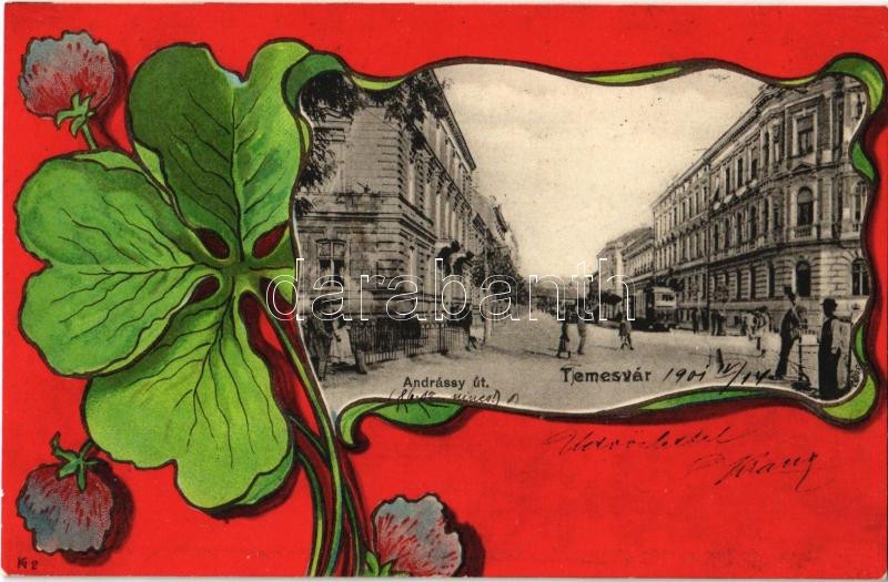 1901 Temesvár, Timisoara; Andrássy út, villamos. Szecessziós lóherés l... https://www.darabanth.com/hu/33-Nagyaukcio/33.1/Kepeslapok/Erdely~13901/1901-Temesvar-Timisoara-Andrassy-ut-villamos-Szecesszios-loheres-litho-keret-Uhrmann-Henr~II2125440