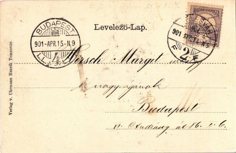 Leírás: 1901 Temesvár, Timisoara; Andrássy út, villamos. Szecessziós lóherés litho keret, Uhrmann Henrik kiadása / street. Art Nouveau clover litho