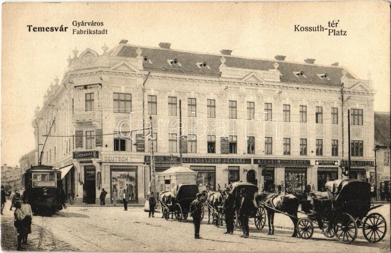 1906 Temesvár, Timisoara; Gyárváros, Kossuth tér, lovas hintók, Korona Bank, villamos, Deutsch T., Steingaszner Ferenc, Wilheim Fülöp, Goldmann S., Harang Gusztáv, Morgenstern Zsigmond és Lazarevits üzlete, gyógyszertár. Nägele Antal gyógyszertári pecsétje a hátoldalon / Fabrikstadt / Fabrica, shops, pharmacy, tram, chariots, bank, square