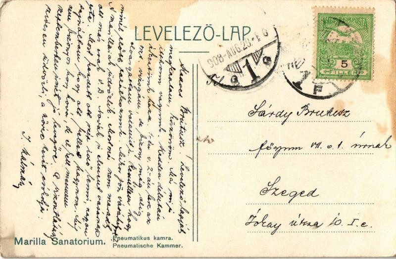 1908 Marilla, Marila; szanatórium, pneumatikus kamra / anatorium, pneu... https://www.darabanth.com/hu/33-Nagyaukcio/33.1/Kepeslapok/Erdely~13901/1908-Marilla-Marila-szanatorium-pneumatikus-kamra-anatorium-pneumatic-chamber-EK~II2133474