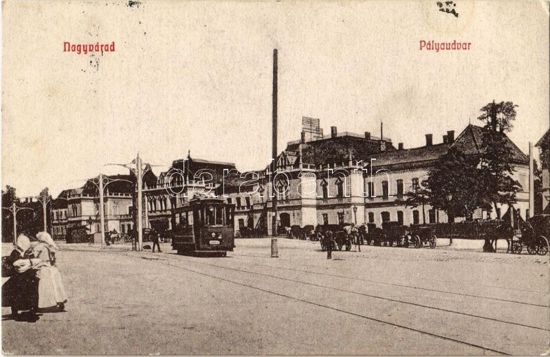 1908 Nagyvárad, Oradea; vasútállomás, villamos / railway station, tram https://www.darabanth.com/hu/33-Nagyaukcio/33.1/Kepeslapok/Erdely~13901/1908-Nagyvarad-Oradea-vasutallomas-villamos-railway-station-tram~II2132200