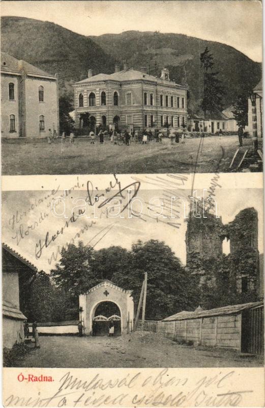 Leírás: 1909 Óradna, Alt-Rodna, Radna veche, Rodna; Főszolgabíróság, templom rom. Karácsonyi János kiadása / court, church ruins