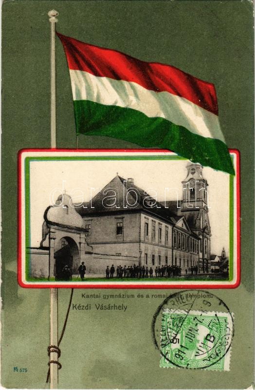 1911 Kézdivásárhely, Targu Secuiesc; Kantai gimnázium, római katolikus templom. Magyar zászlós litho montázs / grammar school, church. Hungarian flag montage, litho. TCV card