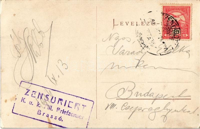 Leírás: Morgonda, Mergeln, Merghindeal; Városháza / Gemeindehaus / town hall + "Zensuriert K.u.K. Mil. Briefzensur Brassó"
