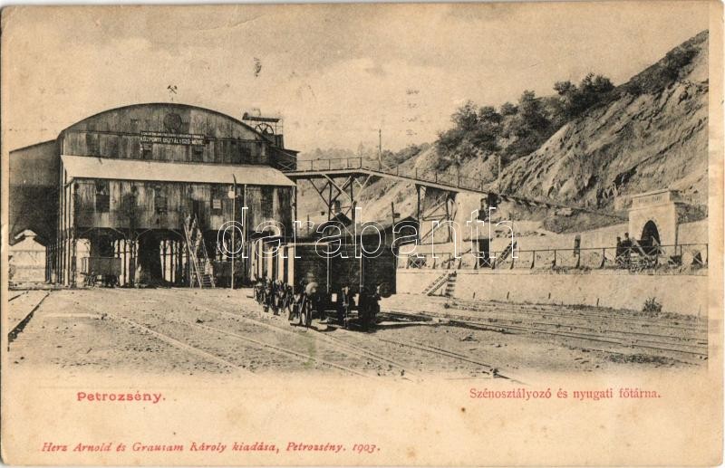 Petrozsény, Petrosani; Szénosztályozó és nyugati főtárna, ipari vasút, vagon. Herz Arnold és Grausam Károly kiadása / coal mine, industrial railway, train (Rb)