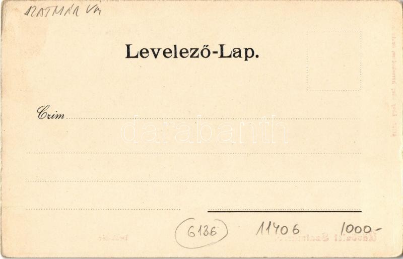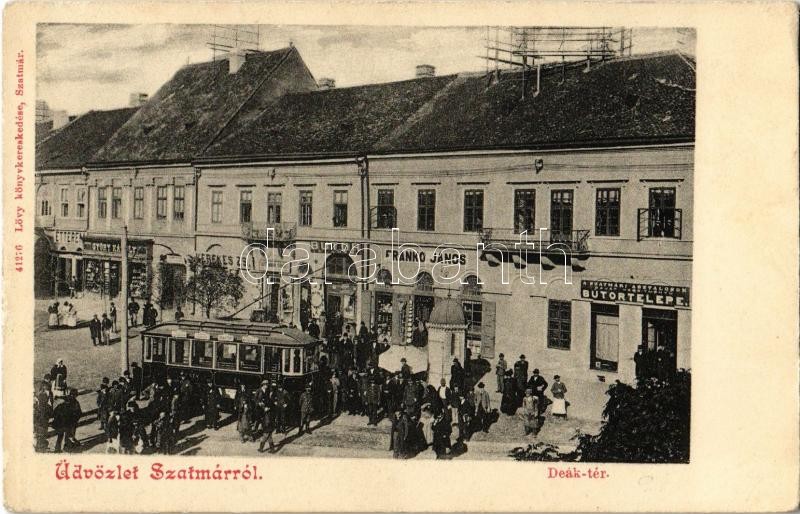 Szatmárnémeti, Szatmár, Satu Mare; Deák tér, Frankó János, Kerekes Zs., Győri Károly üzletei, Szatmári Asztalosok bútortelepe, étterem, villamos, tömeg. Löwy Miksa kiadása / square, shops, carpenters' furniture workshop, restaurant, tram, crowd