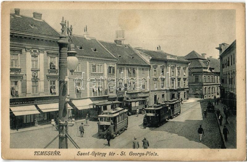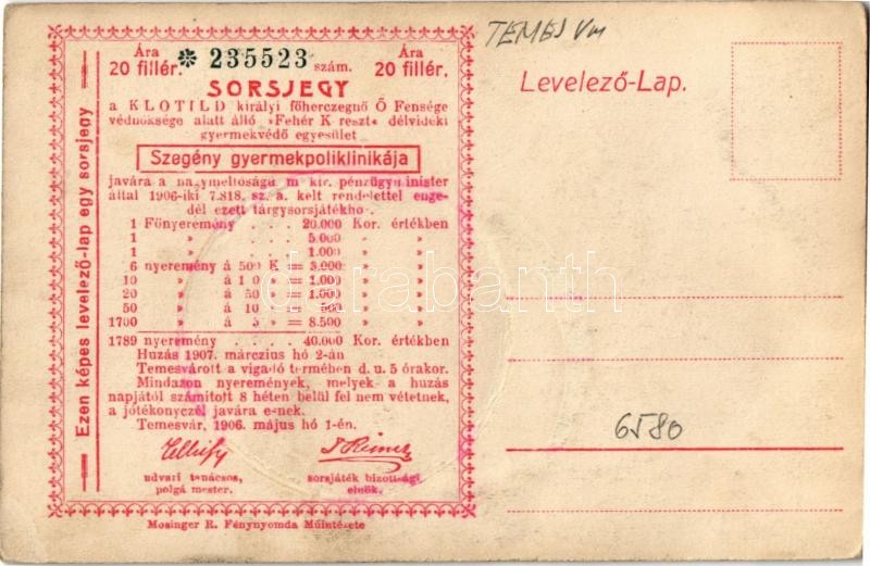 Temesvár, Timisoara; Szent György tér, villamosok, Lenz szálloda, Keppich Kálmán, Palagyi József, Rosenberg M., Szagosan és Rosner Márk üzlete, látszerész. Hátoldalon sorsjegy a Szegény gyermekpoliklinika javára / square, trams, hotel, shops. Charity lottery ticket on the backside