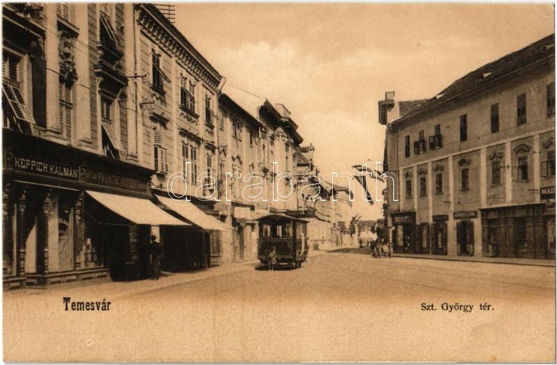 Temesvár, Timisoara; Szt. György tér, villamos, Keppich Kálmán és Palá... https://www.darabanth.com/hu/33-Nagyaukcio/33.1/Kepeslapok/Erdely~13901/Temesvar-Timisoara-Szt-Gyorgy-ter-villamos-Keppich-Kalman-es-Palagyi-Jozsef-uzlete-Le~II2132178