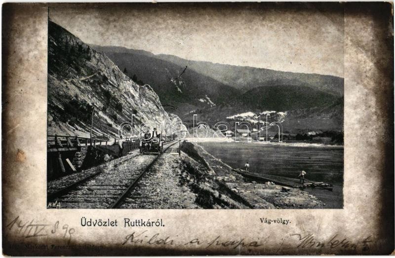 1899 Ruttka, Vrútky; Vágvölgyi vasútvonal, hajtány a síneken, tutajoso... https://www.darabanth.com/hu/33-Nagyaukcio/33.1/Kepeslapok/Felvidek~13903/1899-Ruttka-Vrutky-Vagvolgyi-vasutvonal-hajtany-a-sineken-tutajosok-Kiadja-Moskoczi-Fere~II2140965